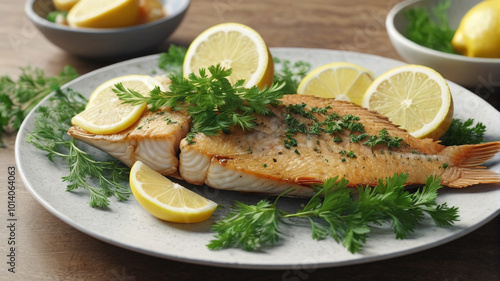 Garnished with slices of lemon and sprigs of parsley, the fried fish on the platter is a simple yet elegant dish, bursting with freshness and flavor, Generative AI