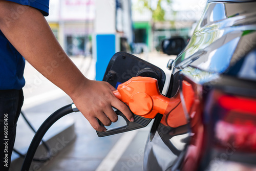 Gasoline being refilled at a petrol station. Refueling Diesel fuel is used to power a car..