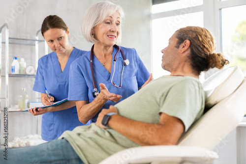 Gastroenterologist doctor consulting man in clinic. Patient having medical exam with doctor on illness from stomach discomfort.