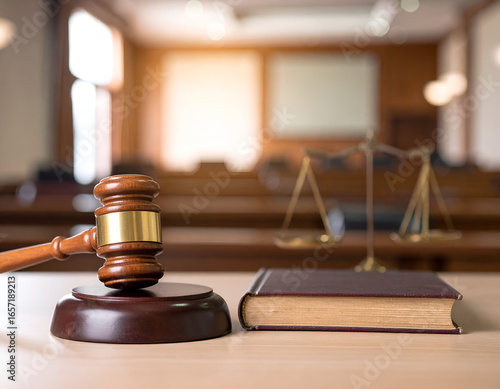 Gavel, law book, and scales of justice on a wooden table in a courtroom. Symbolizing legal proceedings, fairness, and the pursuit of justice.