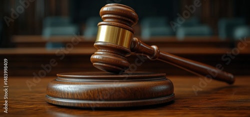 Gavel on Sound Block in Courtroom: Symbol of Justice and Law