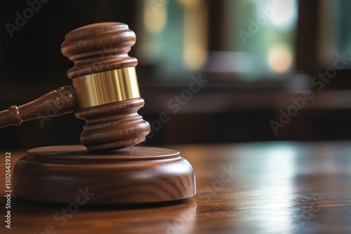 gavel on the table in front of an empty bench, representing justice and court systems. The background is blurred with soft lighting to emphasize its importance