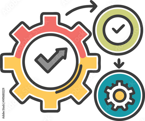Gear with Checkmark Arrows, Color Icon, Process, Workflow, and Transparent Background