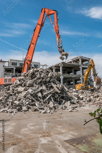 demolition, demolish, demolition, old building, power shovel, sheet, factory, hall, industry, material, metallic, rubbish, debris, dusty