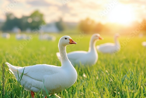 Geese Grazing Peacefully on a Sunny Farm Meadow During the Golden Hour of Early Evening