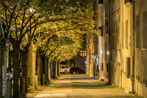 city, inner city, old building, footway, sidewalk, night photography, night, dark, boulevard, building, dwelling, security, street, lighting, street lighting, raid, tree, tree, hall
