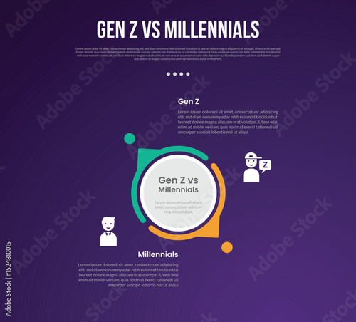Gen z vs Millennials infographic for comparison data with big circle center and creative small arrow outline with modern dark gradient style background with 2 point information