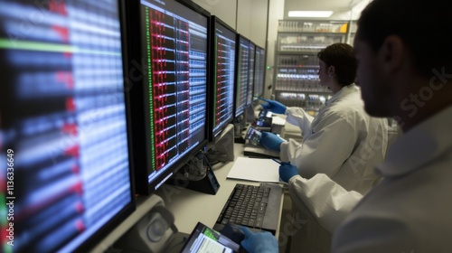 Gene editing research facility: CRISPR-related equipment, scientists examining genetic code on screens