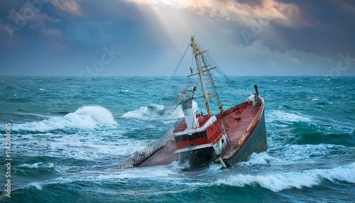 Generated 물속에 반쯤 가라앉은 작은 배, 파도 위로 흔들리는 반파된 배의 일부mage