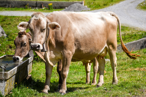 cow, brown, swiss, cattle, fountain, switzerland, alps, mountain, pasture, farm animal, dairy, animal, farm, rustic, european, heritage, alpine, rural, agriculture, tradition, nature, travel, historic, identity, pride, history, bequest, authenticity, environment, mammal, grazing, field, grass, meadow, calf, cow, milk, beef, animal