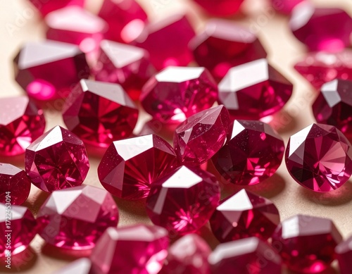 Generated image 鮮やかな赤色のルビー宝石が多数並び、美しく輝く豪華なクローズアップ写真