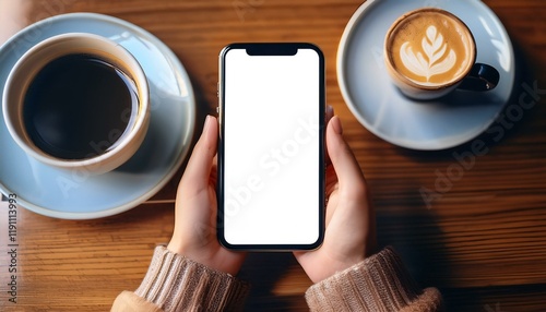 Generated image Mockup a girl holding a smartphone with a blank screen in a cozy cafe setting with a cup