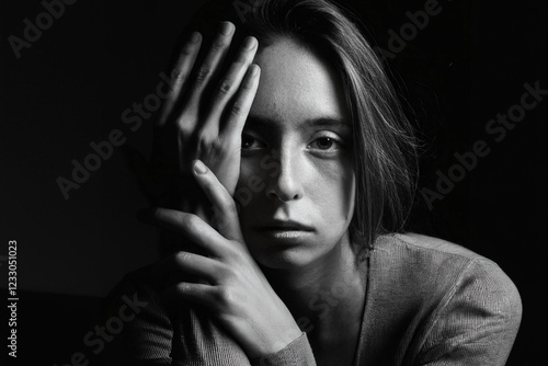 Generated image of a young woman holding her head in distress, symbolizing anxiety, depression, emotional struggle, and mental health challenges, with a dark background emphasizing her sadness.