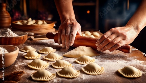 Generated image Pierogi being prepared, with a focus on the dough being rolled out and the filling being added