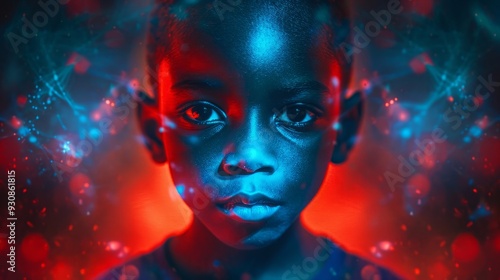 boy, black man, africa, solemn, face, model, portrait, boy, son, dark, neon, dark, light, blue, red, people, person, child rearing, grow, childhood, up