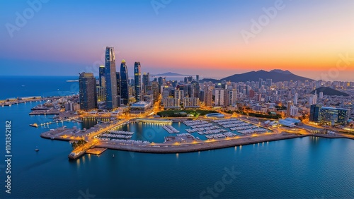 Generative AI, Coastal Cityscape at Sunset with Glass Skyscrapers and Ocean Views