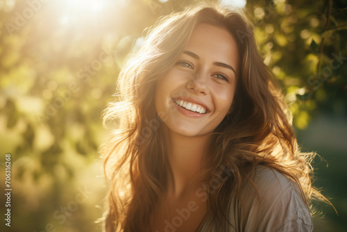 Generative ai collage picture photo of pretty nice woman lady in green woods looking into camera happy portrait