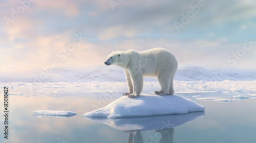 generative AI illustration a polar bear on a small ice cap, surrounded by scattered ice formations, caused by reducing ice extents due to climate change North Pole