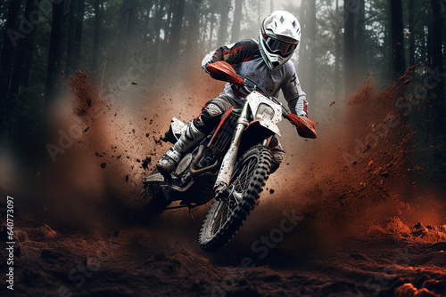 Generative AI image of brave man exploring nature on his motorbike riding through dense forests