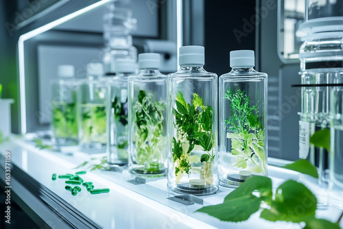Generative AI image of laboratory glass bottles containing herbal green plant samples for alternative medicine research