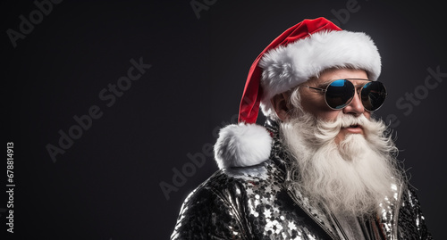 Generative AI photo of cool street vibe Santa Claus in cherry red jacket and sunglasses on a dark back background with copy space