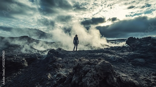 woman, exploring, volcanic, landscape, steaming, crater, dramatic, sky, adventurous, meal, cookery, favor, receipe, ingredient