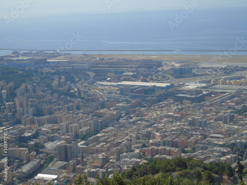 Genova, Italy – 07/30/2020: Beautiful scenic aerial view of the city, port, dam, sea, Cristoforo Colombo airport runway, containers shipping terminal, Pra, Voltri, and Sestri promontory from Monte Gaz