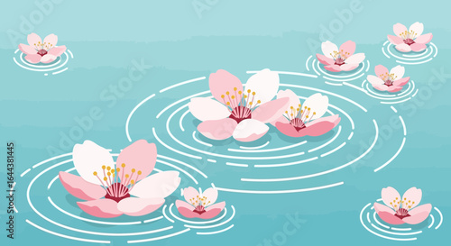 cherry, blossom, flower, water, ripple, pink, white, spring, floating, nature, illustration, vector, design, floral, peaceful, calm, tranquil, serene, background, surface, water, light, colours, season, beauty, zen, spa, wellness, relaxation, japanese, asian, east, sakura, duck pond, bloom, elegance, fresh, purity, garden