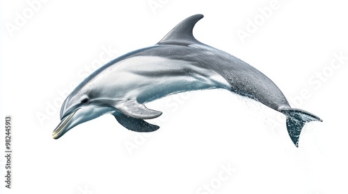Gentle gray dolphin leaping out of the water, captured mid-air with a white background