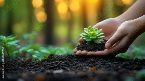 Gentle hands hold a vibrant green succulent plant with soil, symbolizing growth and environmental care in nature's light.