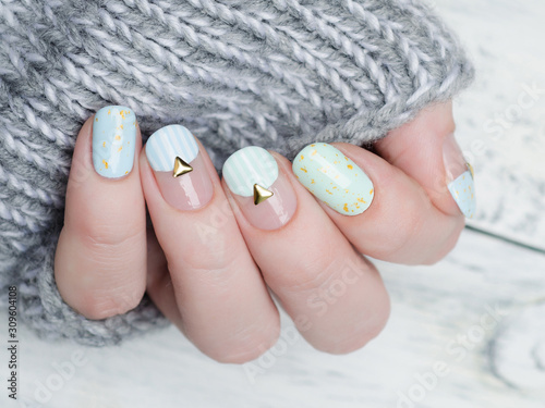 manicure, mint, blue, metal, gold, rivet, glistering, stripes, pattern, grey, knitted, sweater, accessory, nail, minimalism, nail art, polish, stamping, stud, style, swatch, white, woman, lifestyle, young, art, background, beautiful, closeup, colours, creative, lady, decoration, fashion, female, fingernail, girl, glamour, hand, design, texture, gel, beauty, stylish