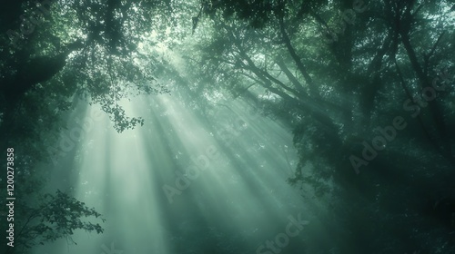Gentle rays of light break through the fog into a dense