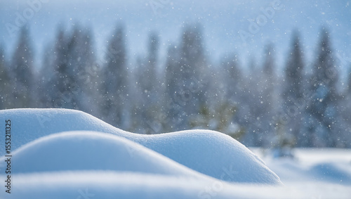 Gentle snowfall blankets soft snowdrifts in a serene winter forest landscape