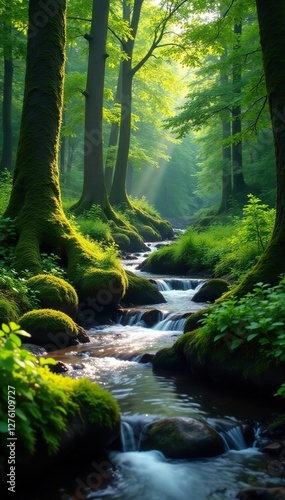 Gentle stream flowing through a forest with moss-covered trees, forest, greenery