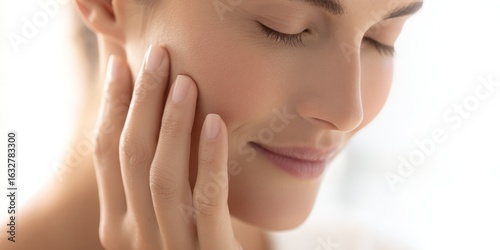 Gentle touch of serenity and beauty captured in soft natural light with a focus on smooth skin and a calm expression