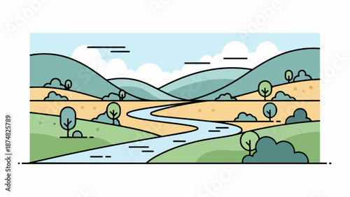 Gently flowing river winding through a lush green landscape with rolling hills and distant mountains under a clear blue sky