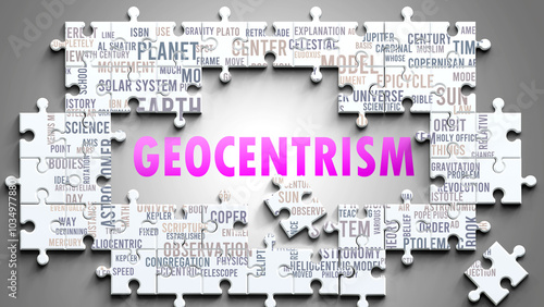 Geocentrism as a complex subject, related to important topics. Pictured as a puzzle and a word cloud made of most important ideas and phrases related to geocentrism. ,3d illustration
