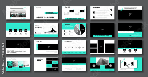 Geometric business presentation templates, turquoise and black elements on white background. Use in flyers and SEO powerpoint, webinar pages, design, banner, annual report, website, Vector infographic