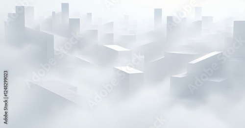 Geometric cityscape of white structures fading into fog, creating a minimalist abstract scene with soft gradients and clean lines, evoking a sense of serene vastness