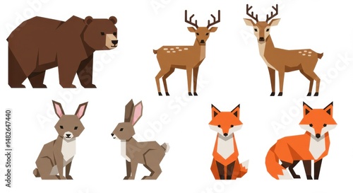 animal, forest, bear, cervid, fox, rabbit, illustration, geometric, wildlife, nature, timberland, fauna, vector, design, style, polygonal, flat, graphic, white, background, isolated, simple, modern, creative, art, shape, brown, orange, ear, antler, sitting, standing, facing, front, side, head, body, tail, leg, spotted, dot, mammal, herbivore, carnivore, cute, decorative, digital, minimalist, cartoon