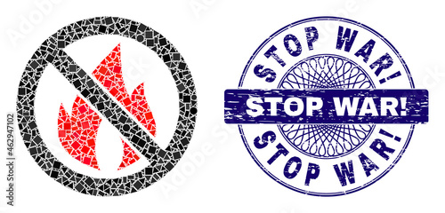 Geometric mosaic stop fire, and Stop War! corroded stamp seal. Violet stamp seal has Stop War! tag inside round shape. Vector stop fire mosaic is organized with scattered round, triangle,