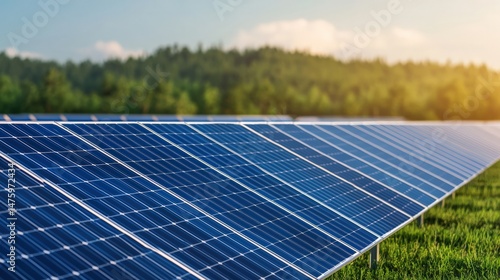 Geometrically arranged solar panels harnessing bright sunlight in a futuristic solar farm, surrounded by lush greenery, showcasing sustainable energy innovation