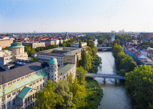 outdoors, day, aerial view, tree, plant, architecture, building exterior, german, munich, bavaria, museum, building, built structure, river, water, city, travel, vacation, nobody, travel destination, city landscape, city view, community, bridge, transportation, photo, color image