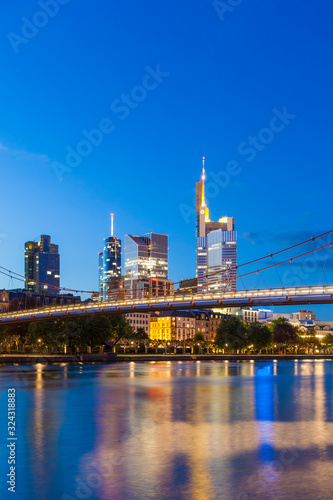 nobody, building, copy space, main, water reflection, financial district, bridge, connection, twilight, illuminated, clear sky, travel, outdoors, frankfurt, urban scene, architecture, skyline, skyscraper, blue skies, city landscape, built structure, transportation, sky, hesse, german, urban, city, tour tourism, city view, tower block, photo, color image