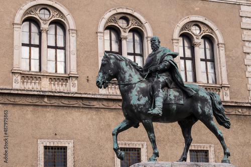 Germany, Munich- December 20,2021: View of prince regent Luitpold equestrian statue next to famous Bavarian National Museum in the city center of the Bavarian capital.