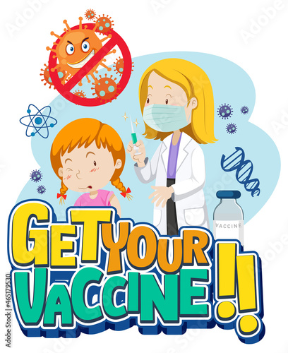 Get Your Vaccine font banner with doctor injecting vaccine to a girl cartoon character