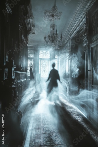 hallway, ghost, apparition, fog, misty, aethereal, shadowy, darkness, antique, luxury home, interior, corridor, ornate, skittish, mysterious, haunted, vintage, gloomy, old, faded, elegance, spectral, semitransparent, chilling, suspense, fear, sombre, foggy