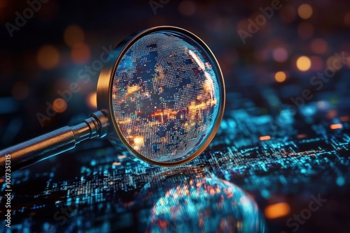 Giant Digital Magnifying Glass Zooming in on Binary Code and Data Patterns in Futuristic Analysis