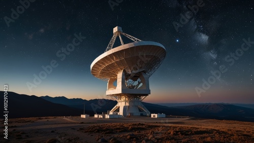 Giant radio telescope scanning deep space near a mountaintop observatory