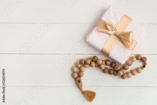 bead, box, gift, prayer, ramadan, table, white, wooden, 2024, allah, arabian, arabic, background, belief, celebrate, celebration, colours, copy, culture, eastern, faith, fasting, festive, flat, greeting, holiday, islam, islamic, koran, lay, month, muslim, nobody, object, pray, religion, space, text, top, traditional, view